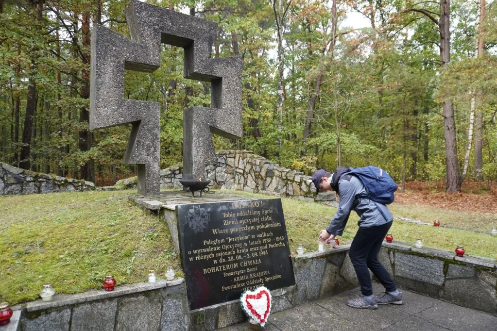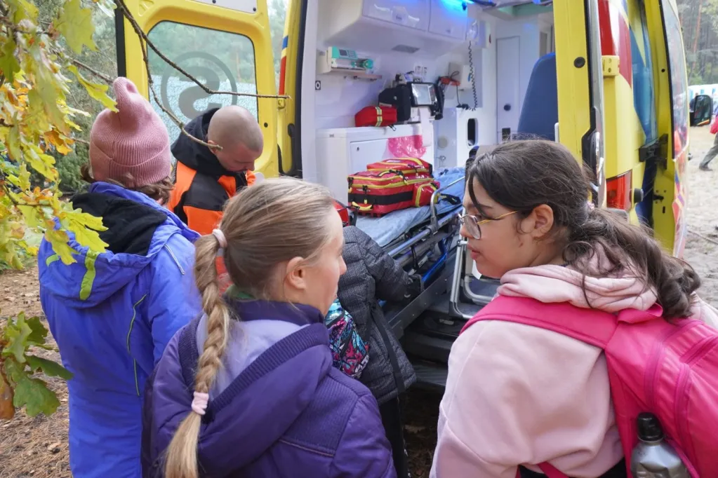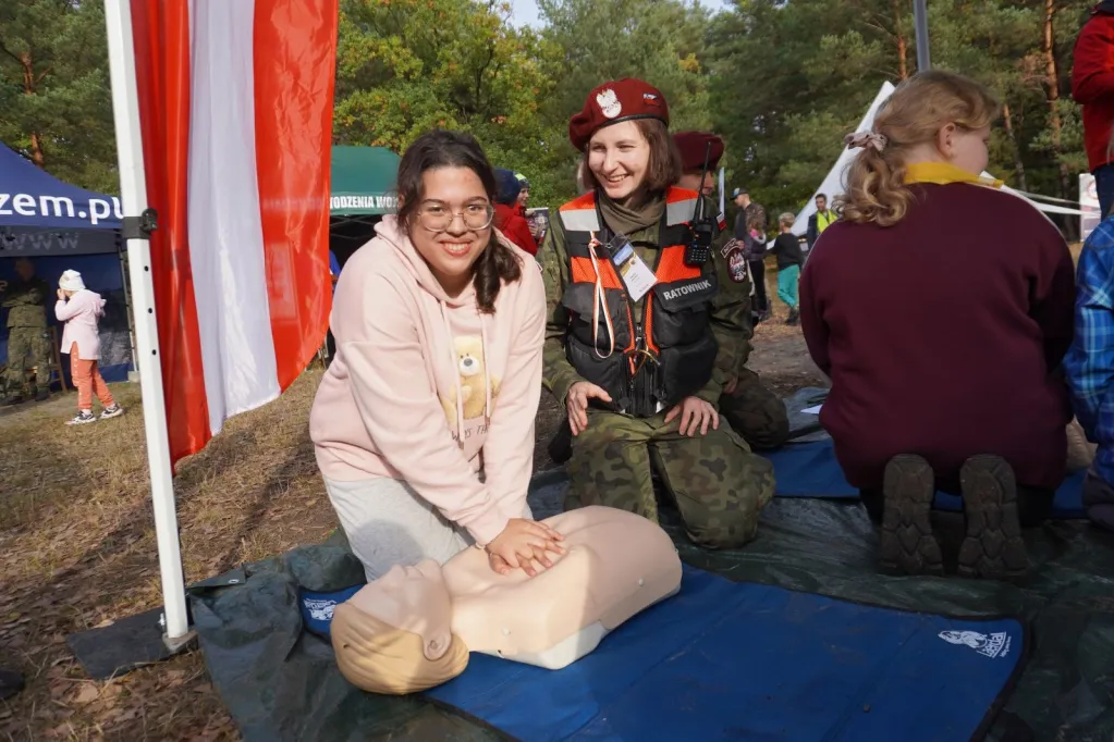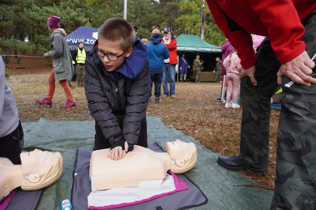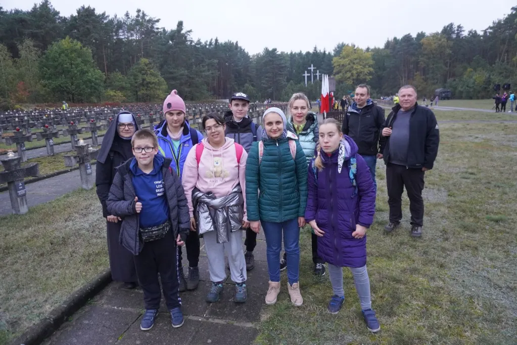 Potem powędrowaliśmy niebieskim szlakiem przez Izabelin, Sieraków do Pociechy. Zatrzymaliśmy się przy Krzyżu Jerzyków, gdzie oddaliśmy hołd poległym partyzantom POS "Jerzyki". Zapaliliśmy znicze. Potem udaliśmy się na polanę, gdzie odpoczęliśmy, zjedliśmy pyszną, żołnierską grochówkę, wzięliśmy udział w konkursach, uczyliśmy się ratownictwa medycznego, obejrzeliśmy karetkę pogotowia.