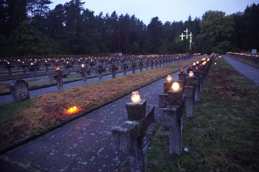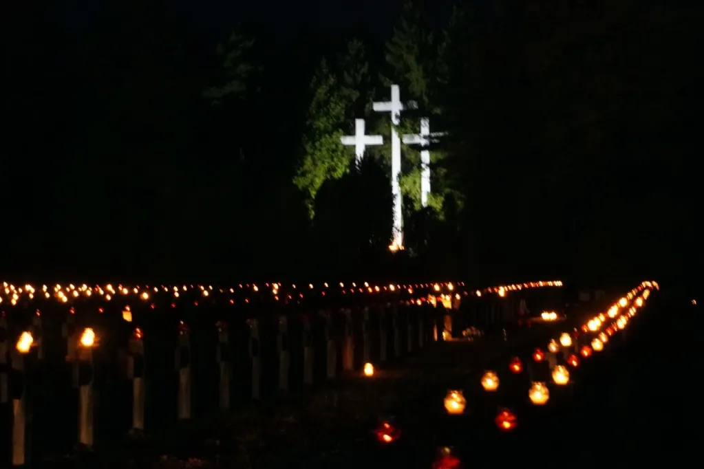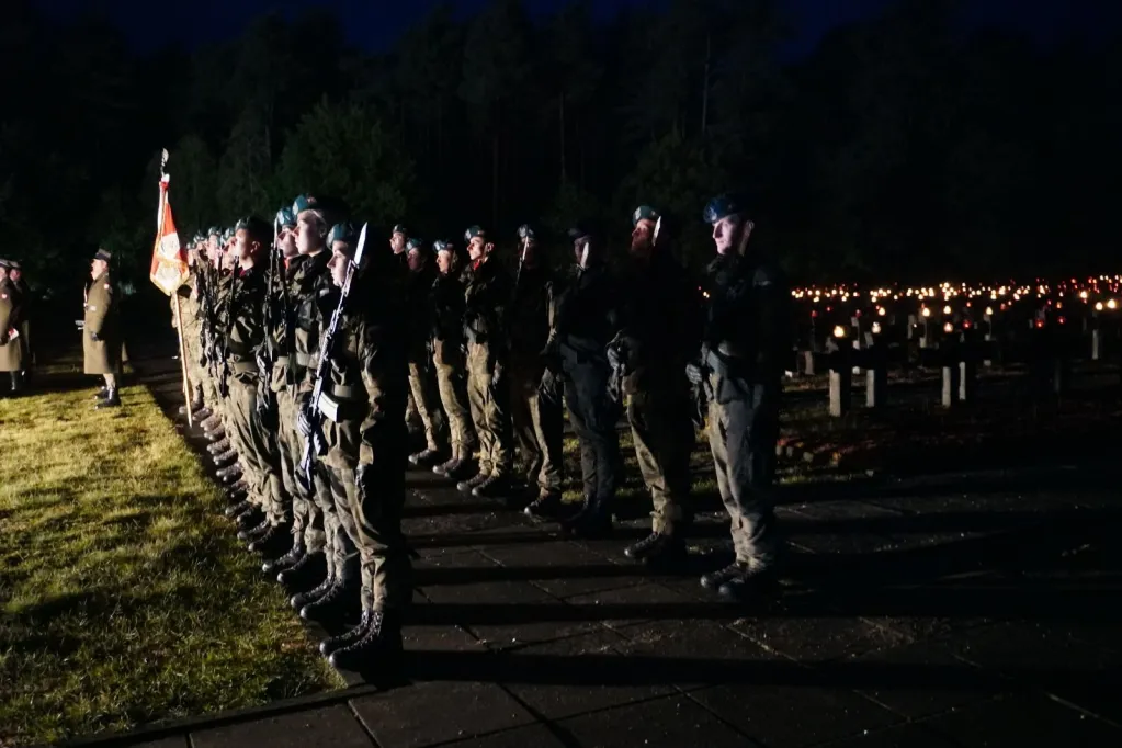 Potem powędrowaliśmy na Cmentarz w Palmirach. Ty odbyła się wzniosła uroczystość poświęcona patriotom pomordowanym w czasie wojny w puszczy kampinoskiej. Wysłuchaliśmy słuchowiska o rozstrzeliwaniu Polaków - więźniów Pawiaka i apelu poległych. Kompania Wojska Polskiego oddała 3 salwy honorowe na cześć pomordowanych pochowanych na Palmirskiej Polanie Śmierci. W zadumie wróciliśmy pod szkołę o 21.00