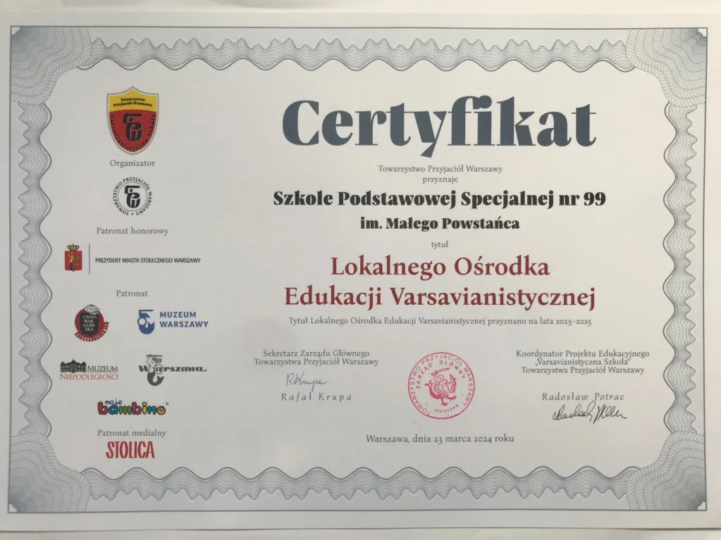 23 marca 2024 r. w Muzeum Warszawskiej Pragi odbyła się uroczystość wręczenia certyfikatów "Varsavianistycznej Szkoły" placówkom, które wyróżniają się w prowadzeniu edukacji o Warszawie. Certyfikat nadawany przez Towarzystwo Przyjaciół Warszawy odebrała pani Ania.