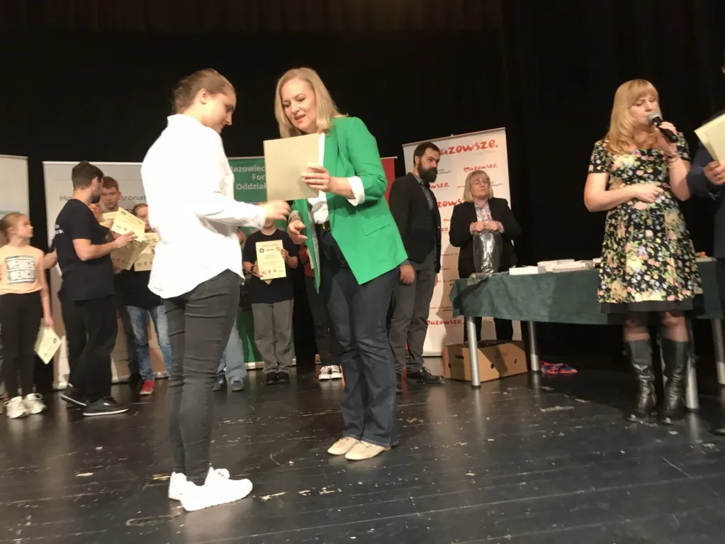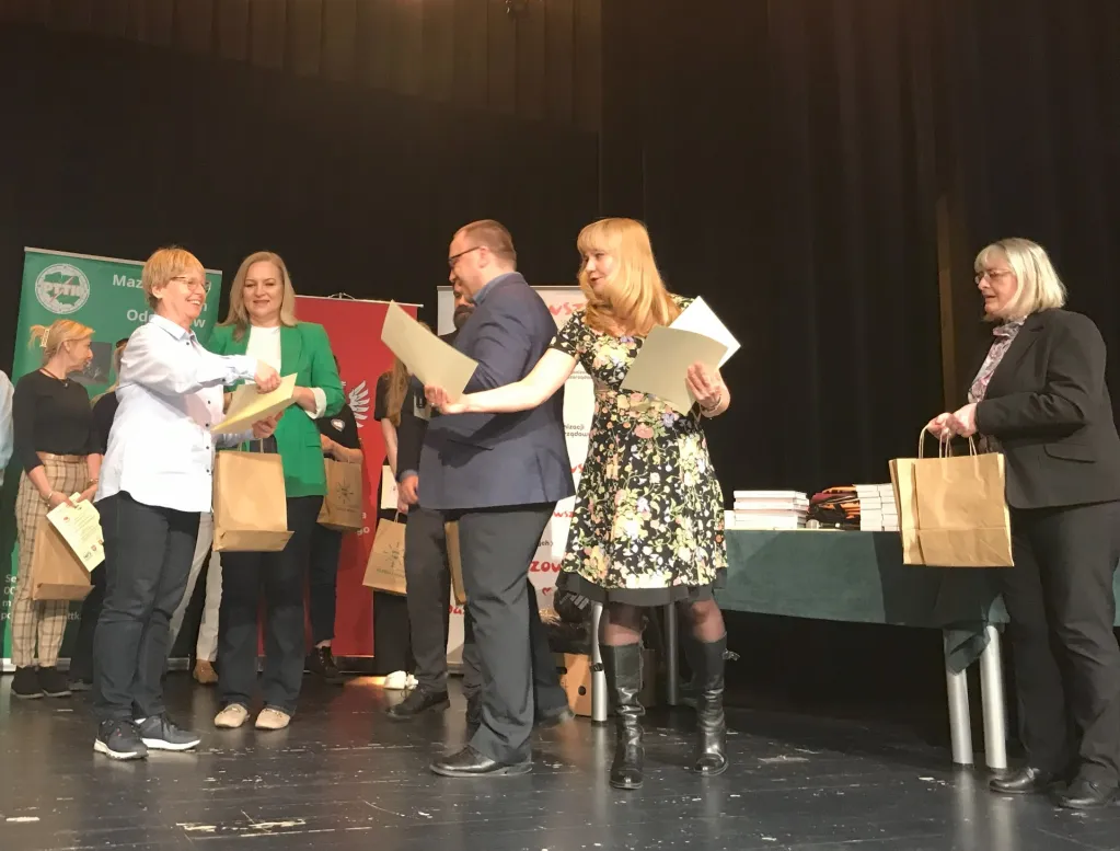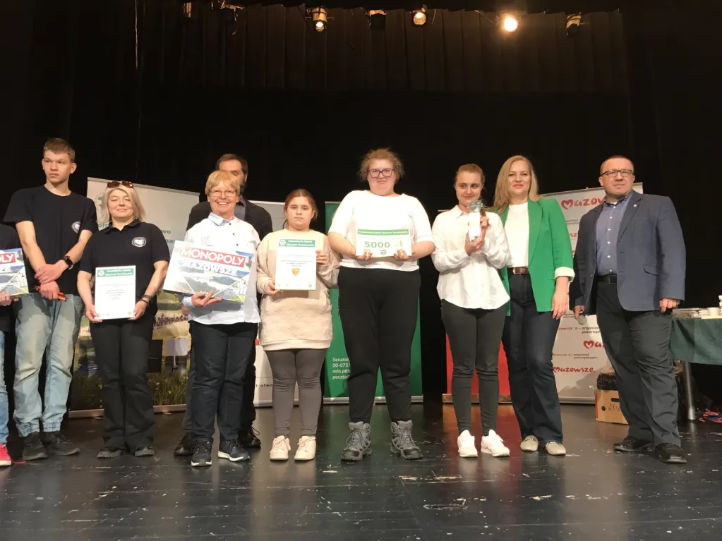 Następnie wręczono nagrody w konkursie „Mazowiecka Szkoła Aktywna Turystycznie”. Nasza szkoła, po raz kolejny zajęła I miejsce. W nagrodę otrzymaliśmy puchar przechodni, 5 tys. zł na kolejne wycieczki oraz grę Monopoly o Mazowszu.