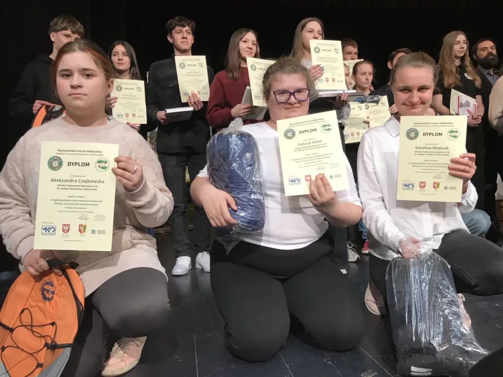 Kolejnym punktem uroczystości było rozdanie nagród w Ogólnopolskim Internetowym Konkursie Wiedzy Turystyczno – Krajoznawczej. Zdeklasowaliśmy wszystkie szkoły specjalne. Nasze uczennice zajęły dwa pierwsze miejsca na podium – Karolina i Patrycja I miejsce, Ola – I miejsce. III miejsce przypadło uczniowi z Oddziału PTTK w Kozienicach.