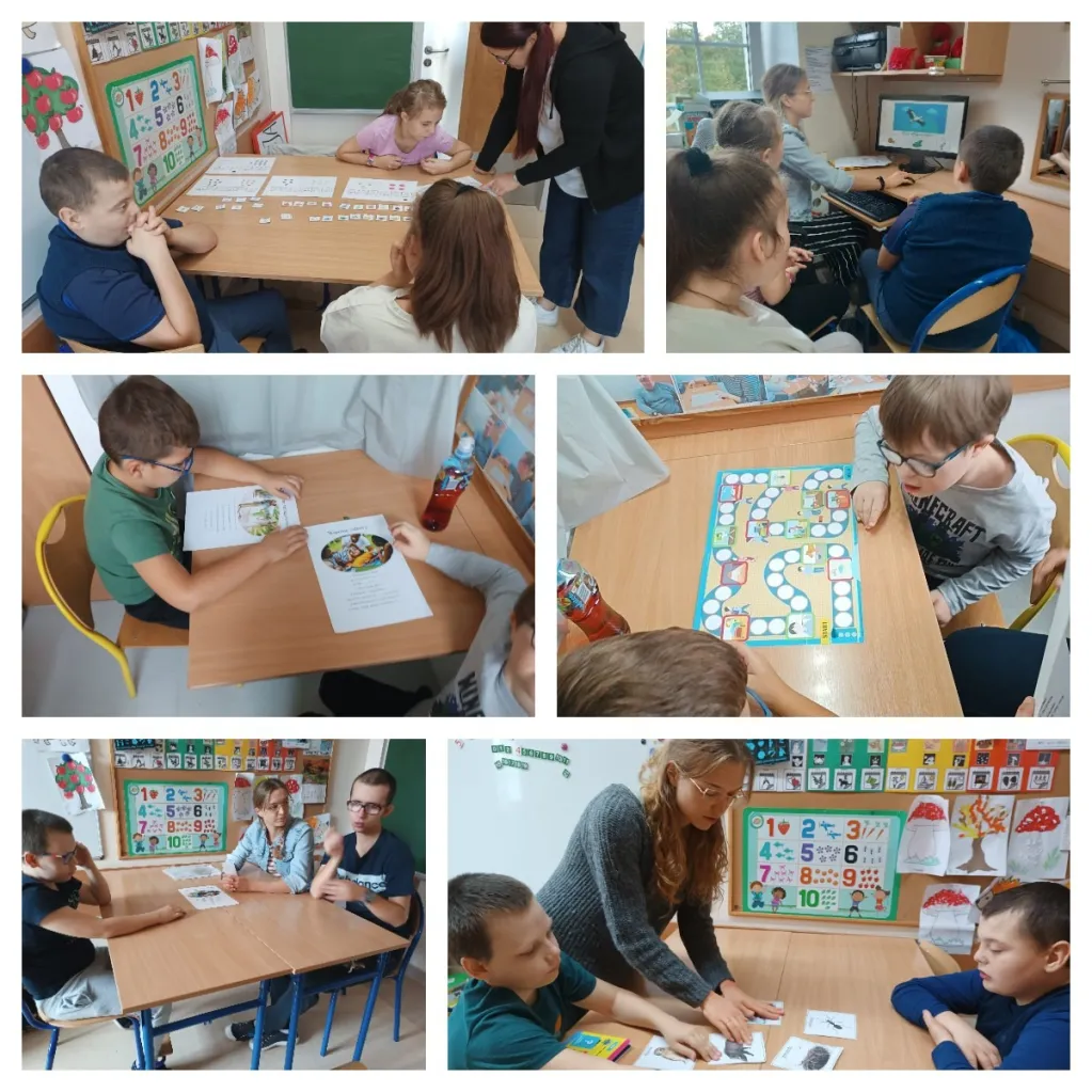 Uczniowie uczestniczyli w prowadzonych przez terapeutów zajęciach łączonych. Celem zajęć było rozwijanie komunikacji między naszymi uczniami oraz rozwijanie umiejętności społecznych i komunikacyjnych w środowisku zewnętrznym.