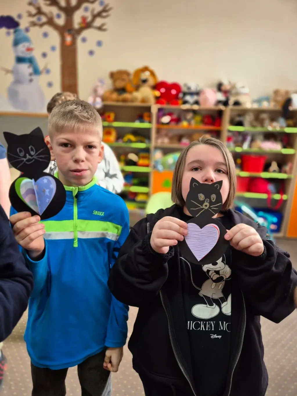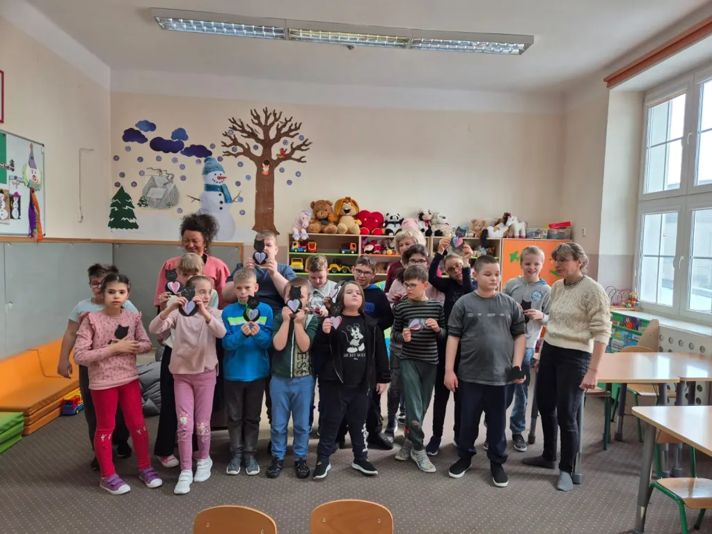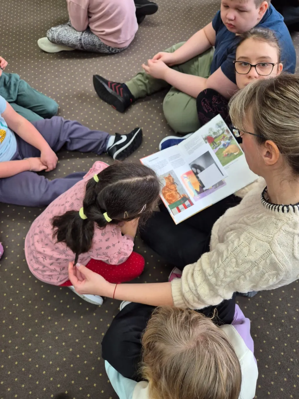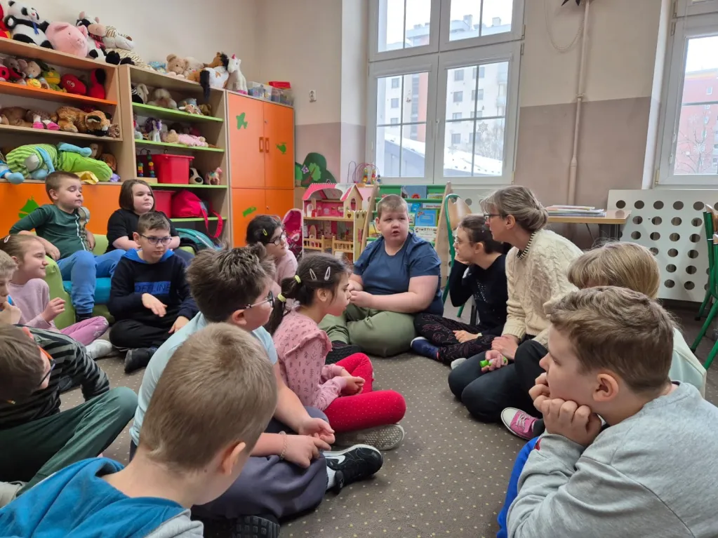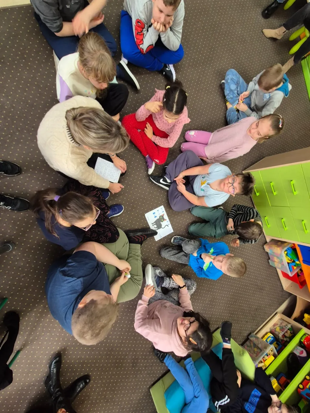 W dniu 20 lutego 2025 miało miejsce cykliczne spotkanie z bibliotekarką z Biblioteki Publicznej w Dzielnicy Targówek panią Iwoną Guzowską. Uczniowie mieli okazję posłuchać tekstu czytanego i pracę plastyczną "Zakochany kot". Spotkaniu towarzyszyła miła atmosfera.