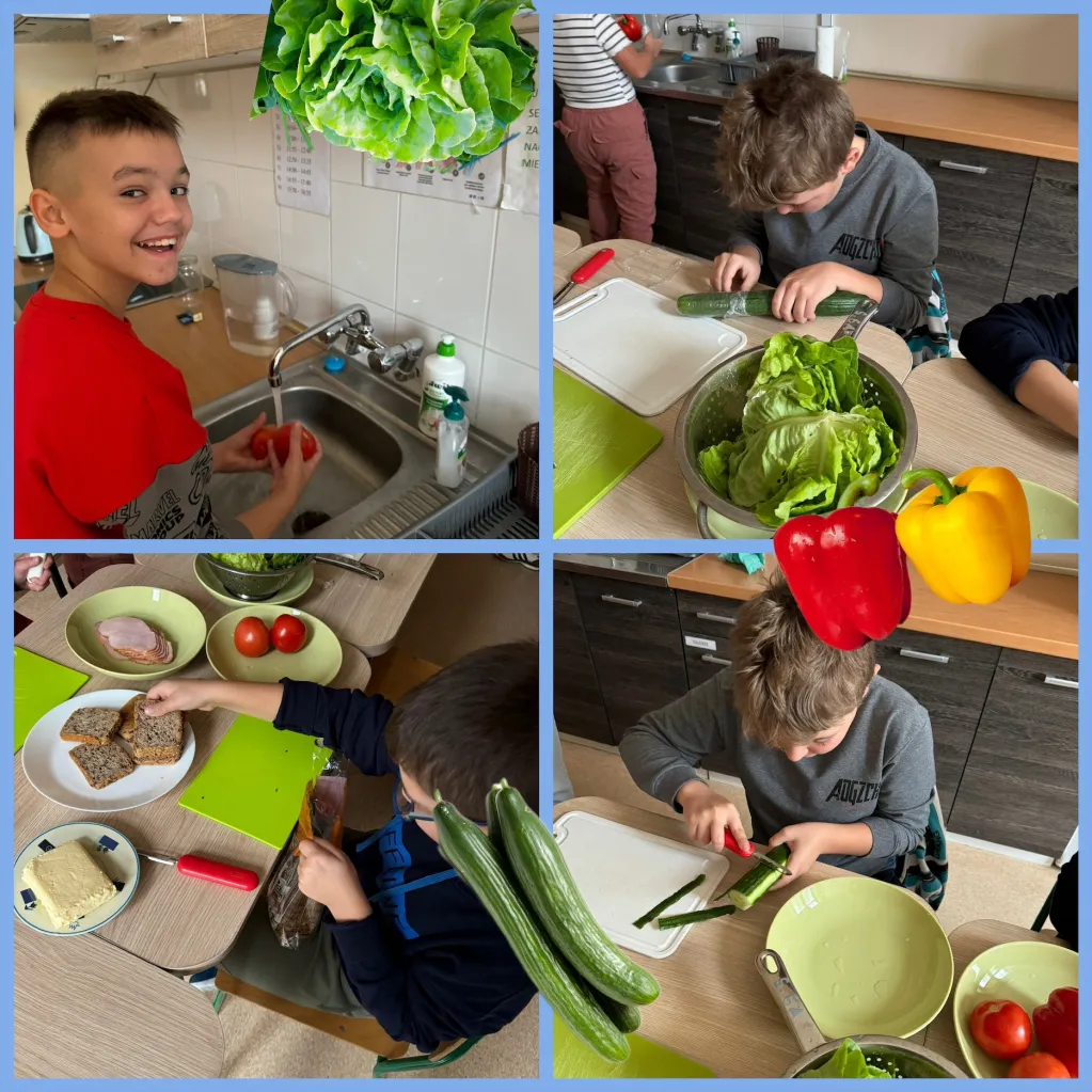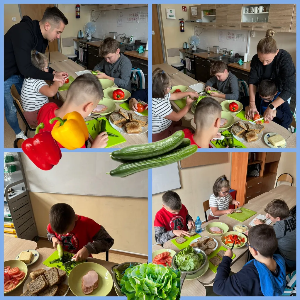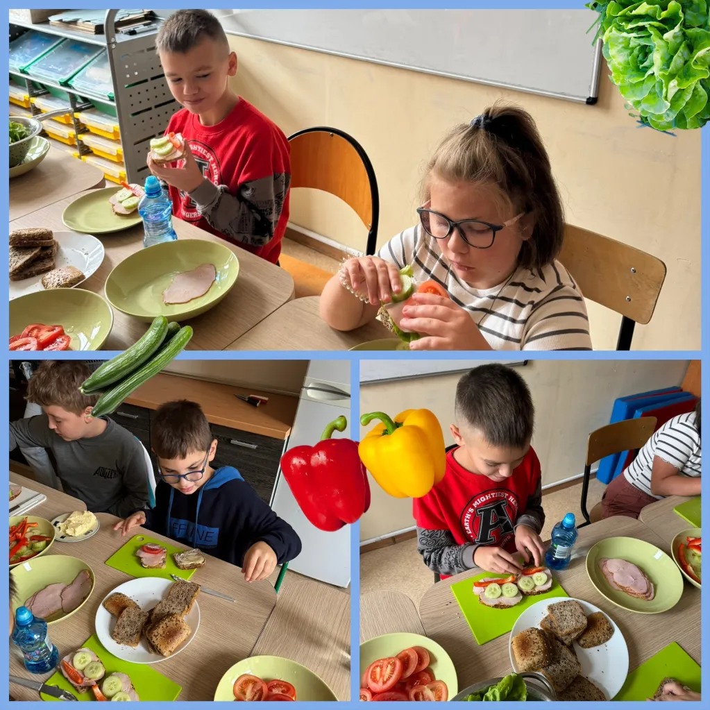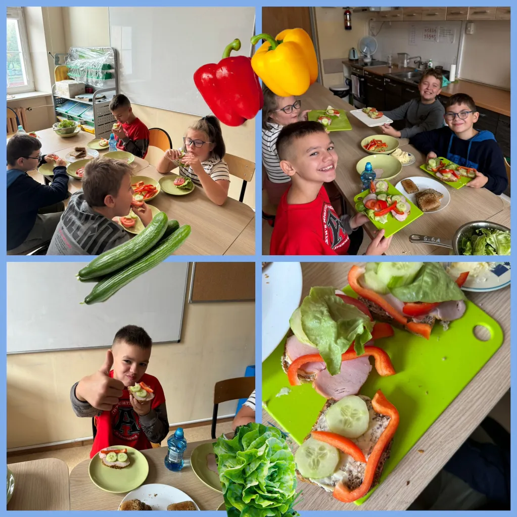 Dzisiaj, 16 października, odbyły się pierwsze zajęcia kulinarne w ramach koła świetlicowego “Kulinarni Odkrywcy”. Celem tych zajęć jest przygotowywanie pysznych i zdrowych śniadań. Dziś uczniowie mieli okazję stworzyć smakowite kanapki z pomidorem, wędliną, ogórkiem, sałatą i papryką. To był naprawdę udany poranek, pełen radości i entuzjazmu. Uczniowie z zaangażowaniem kroili warzywa, układali składniki na kanapkach i dzielili się swoimi pomysłami na idealne śniadanie. Atmosfera była pełna śmiechu i wspólnej zabawy, a gotowe kanapki wyglądały i smakowały wyśmienicie. Po śniadaniu wszyscy uczniowie z zapałem przystąpili do sprzątania swoich stanowisk pracy i mycia naczyń. Wspólne porządkowanie było równie ważnym elementem zajęć, uczącym odpowiedzialności i dbania o czystość. To był wspaniały początek kulinarnych przygód, który na pewno zostanie na długo w pamięci wszystkich uczestników. Już nie możemy się doczekać kolejnych zajęć i nowych, smakowitych wyzwań !🍅🥪🥒