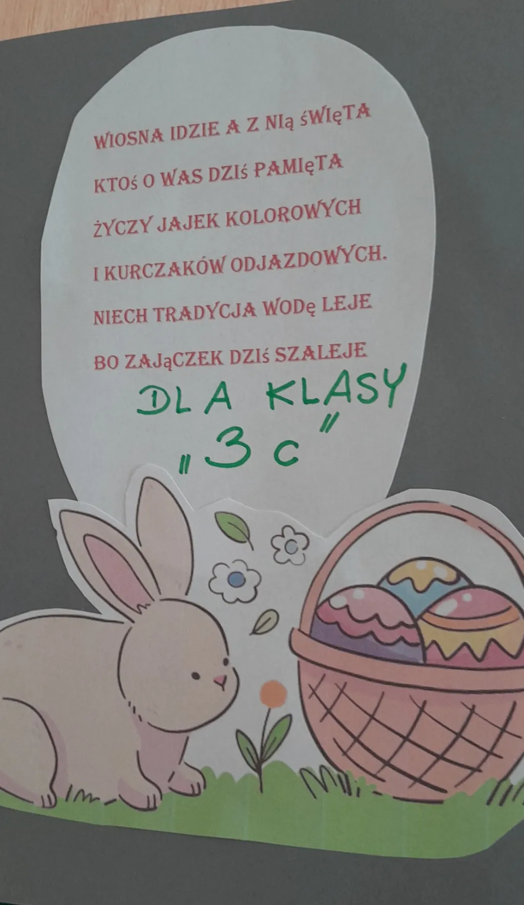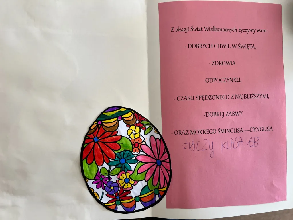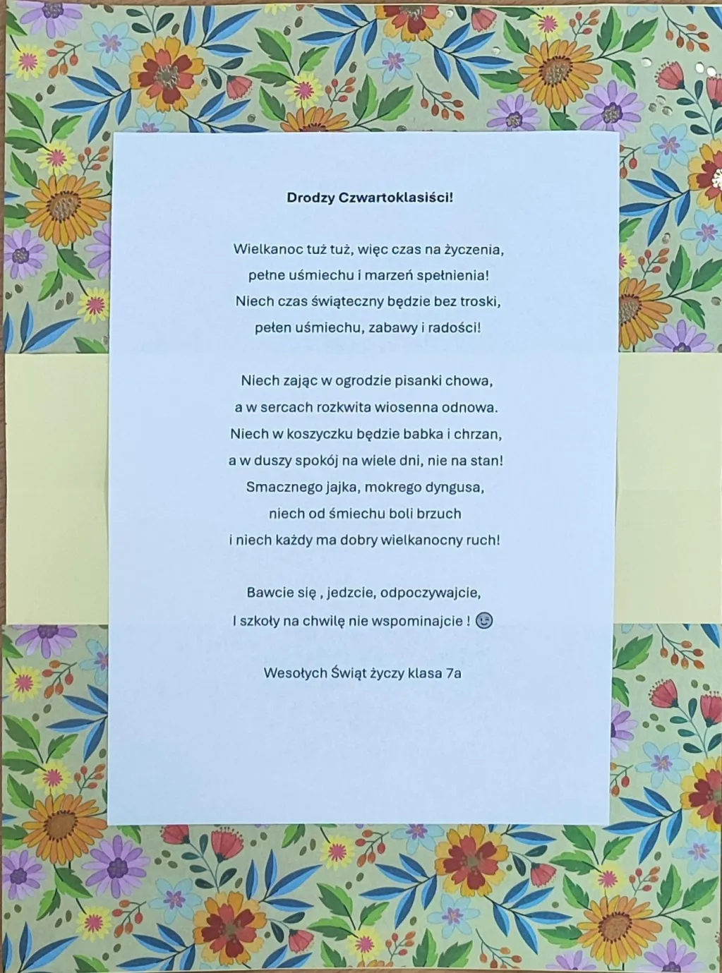 Opublikowano w Informacje bieżące Wspólne życzenia dla klas. Wspólne życzenia dla klas. Opublikowano: 20.04.2025 Z okazji zbliżających się świąt każda klasa przygotowała życzenia dla wylosowanej wcześniej klasy. Oto efekty: