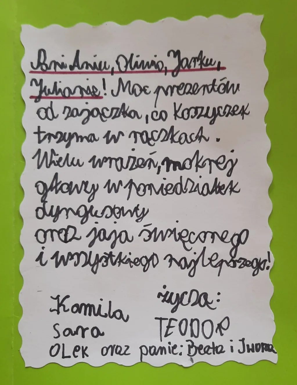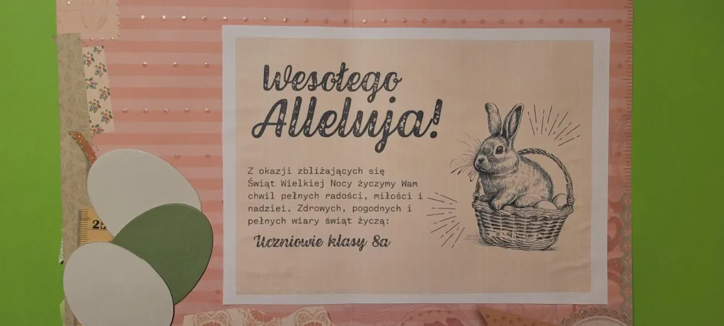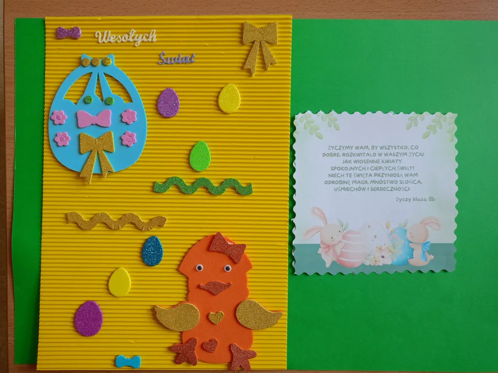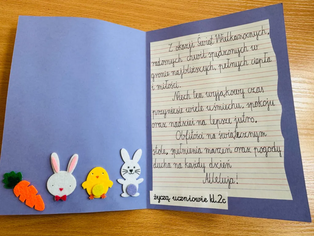Opublikowano w Informacje bieżące Wspólne życzenia dla klas. Wspólne życzenia dla klas. Opublikowano: 20.04.2025 Z okazji zbliżających się świąt każda klasa przygotowała życzenia dla wylosowanej wcześniej klasy. Oto efekty: