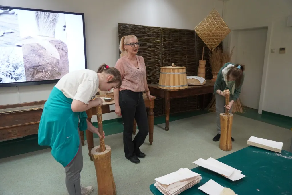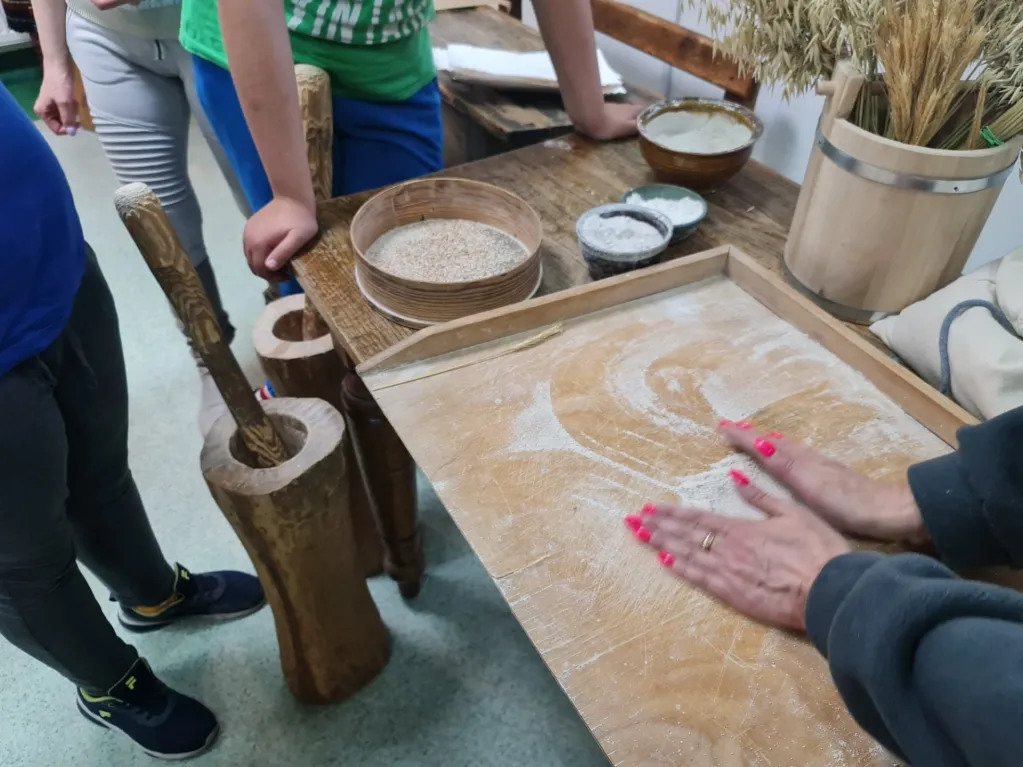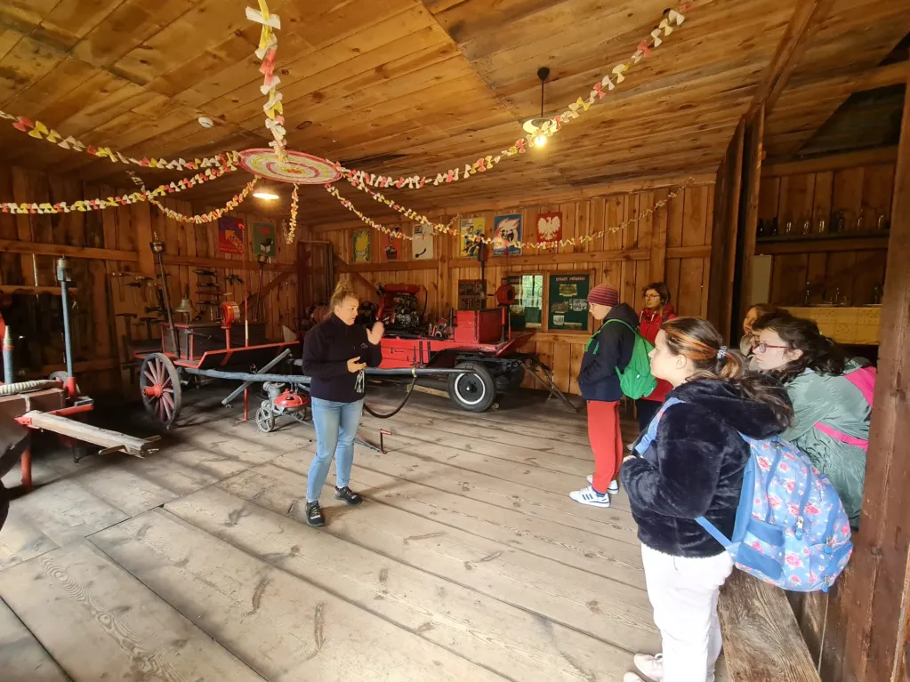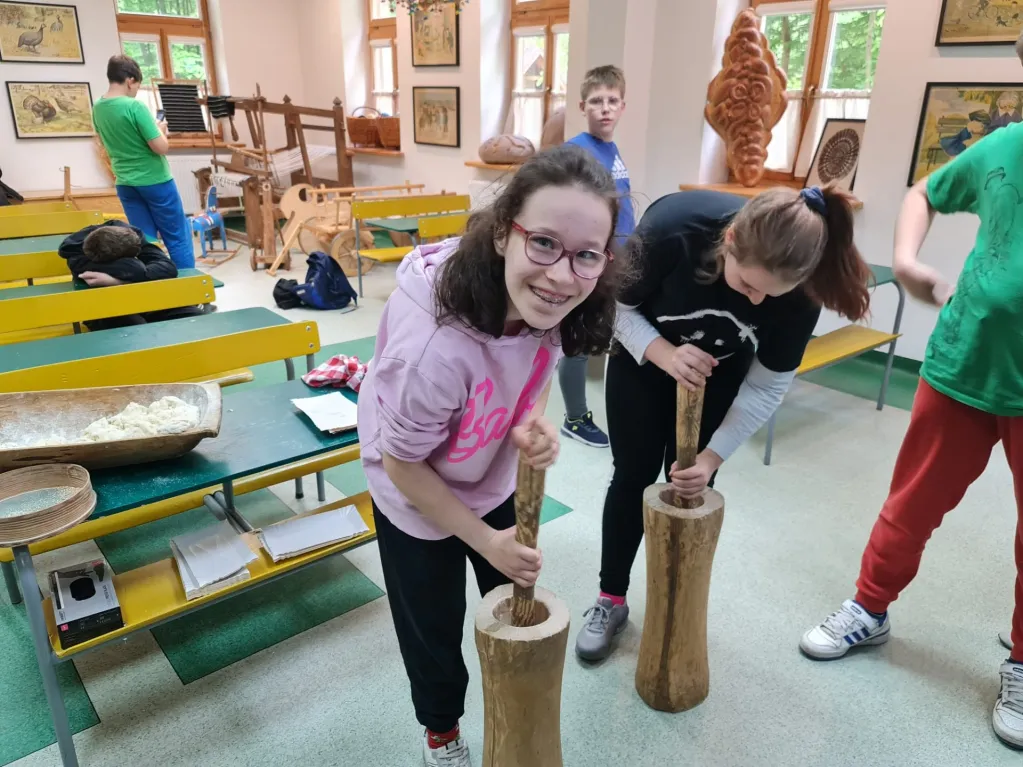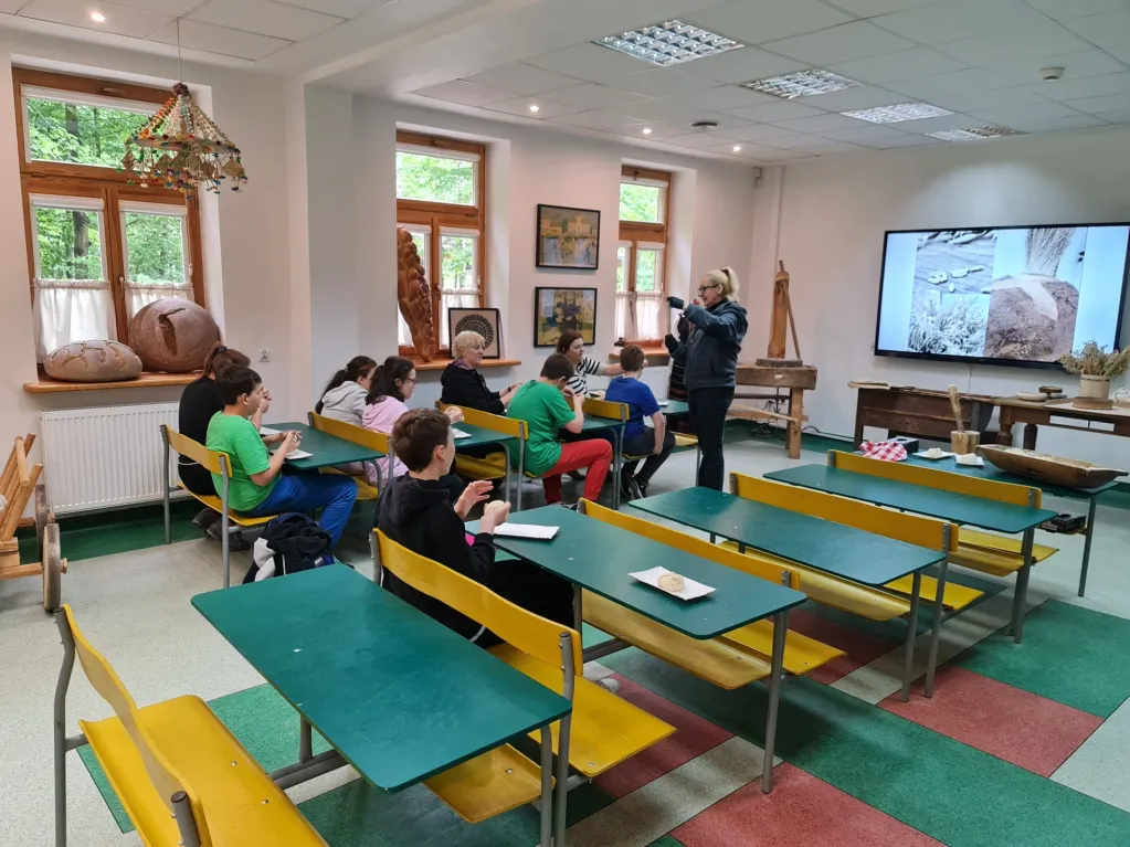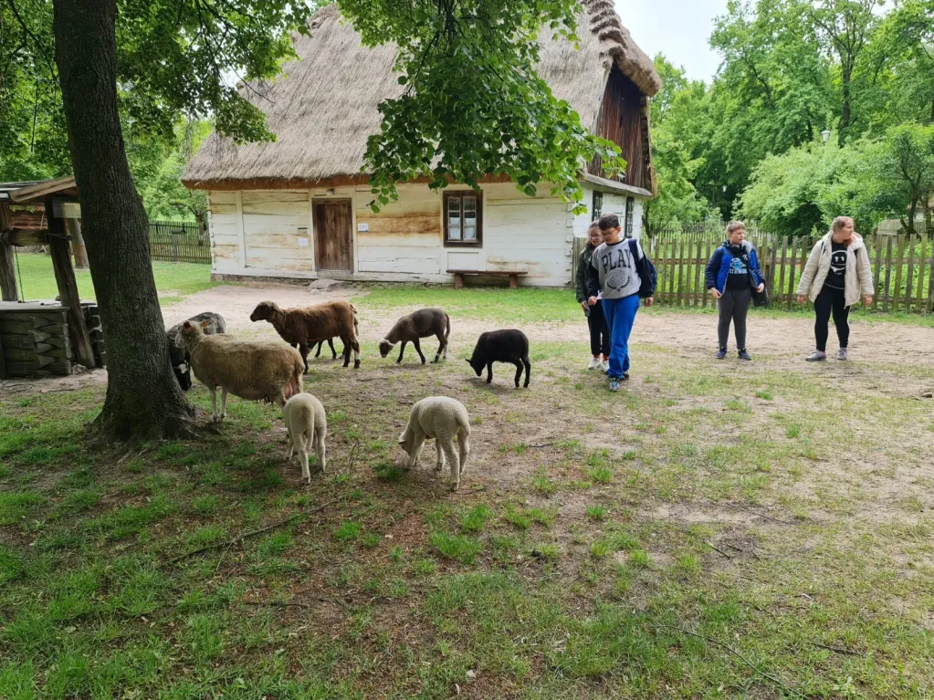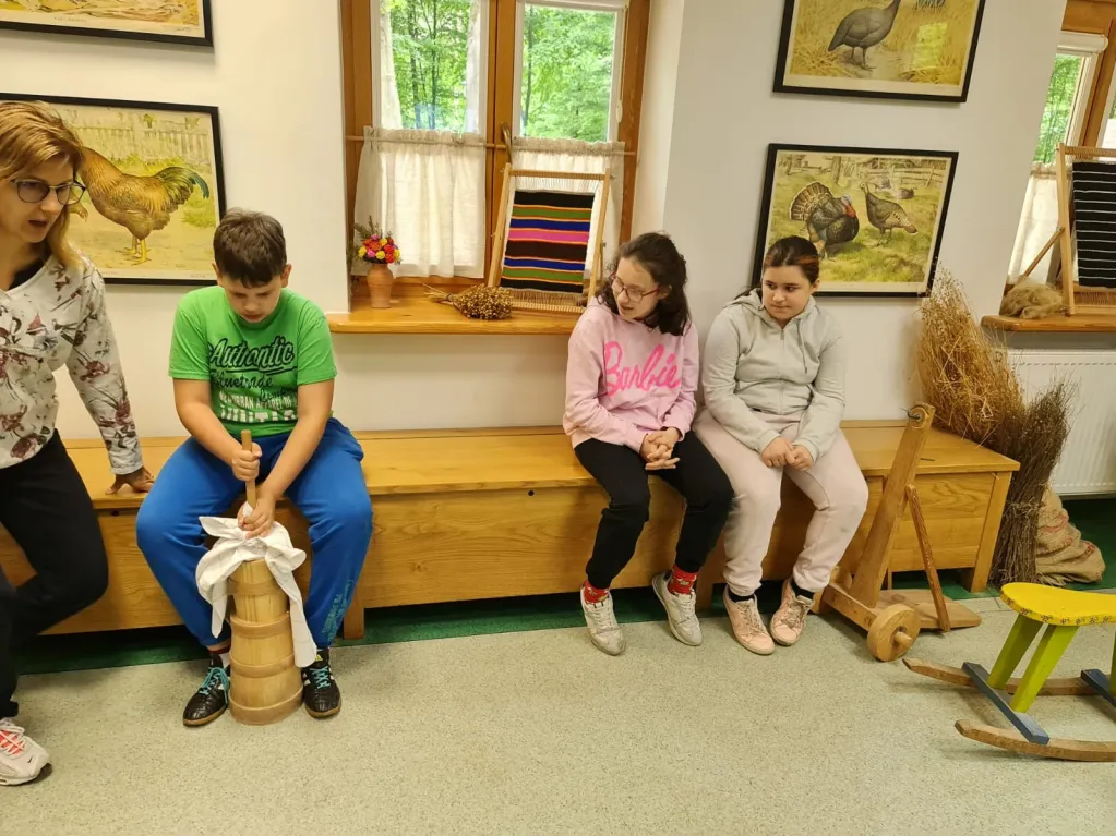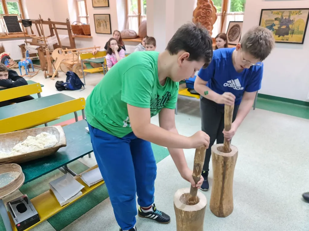 Uczniowie odwiedzili Skansen Wsi Radomskiej, w którym oprócz zwiedzania zabytkowych chat i wiejskich zagród z przewodnikiem uczestniczyli w warsztatach „Od ziarenka do bochenka” oraz „Certyfikat sprawności pradziadka”. Własnoręcznie ubijali ziarno na mąkę oraz robili w kierzance masło. Zrobione przez dzieci i upieczone bułeczki smakowały znakomicie!
