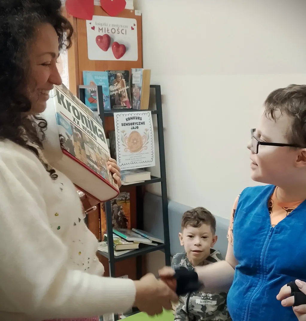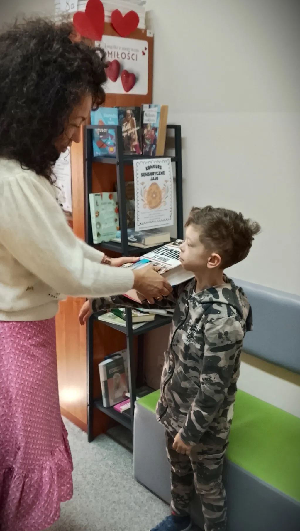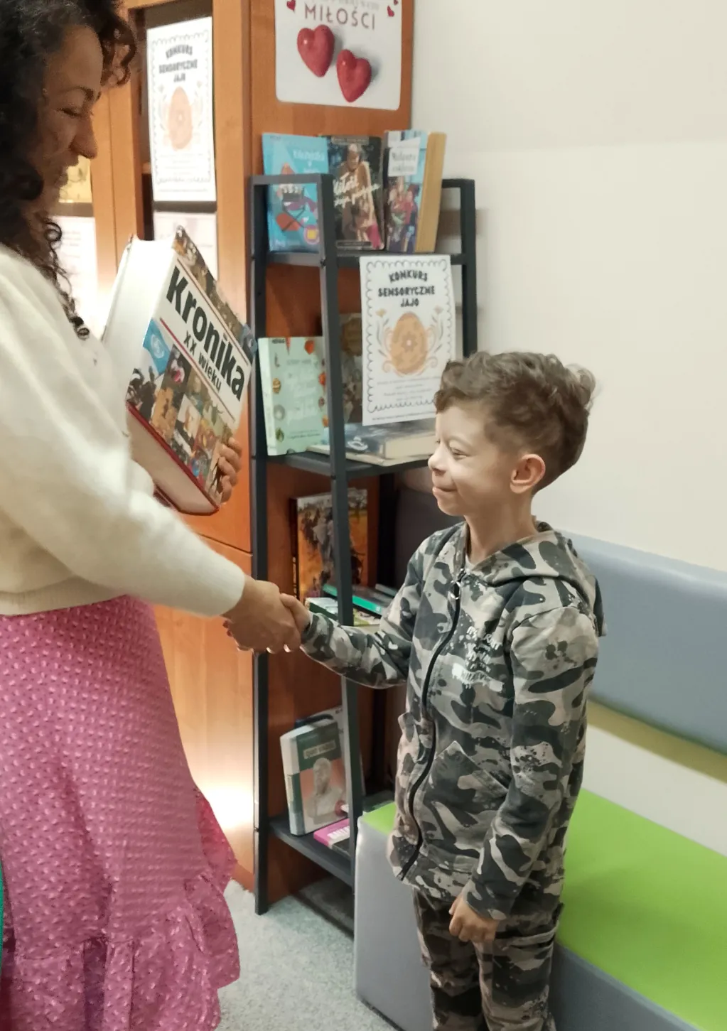 Po pasowaniu dzieci otrzymują upominki, w postaci książek oraz naklejek z logo biblioteki.