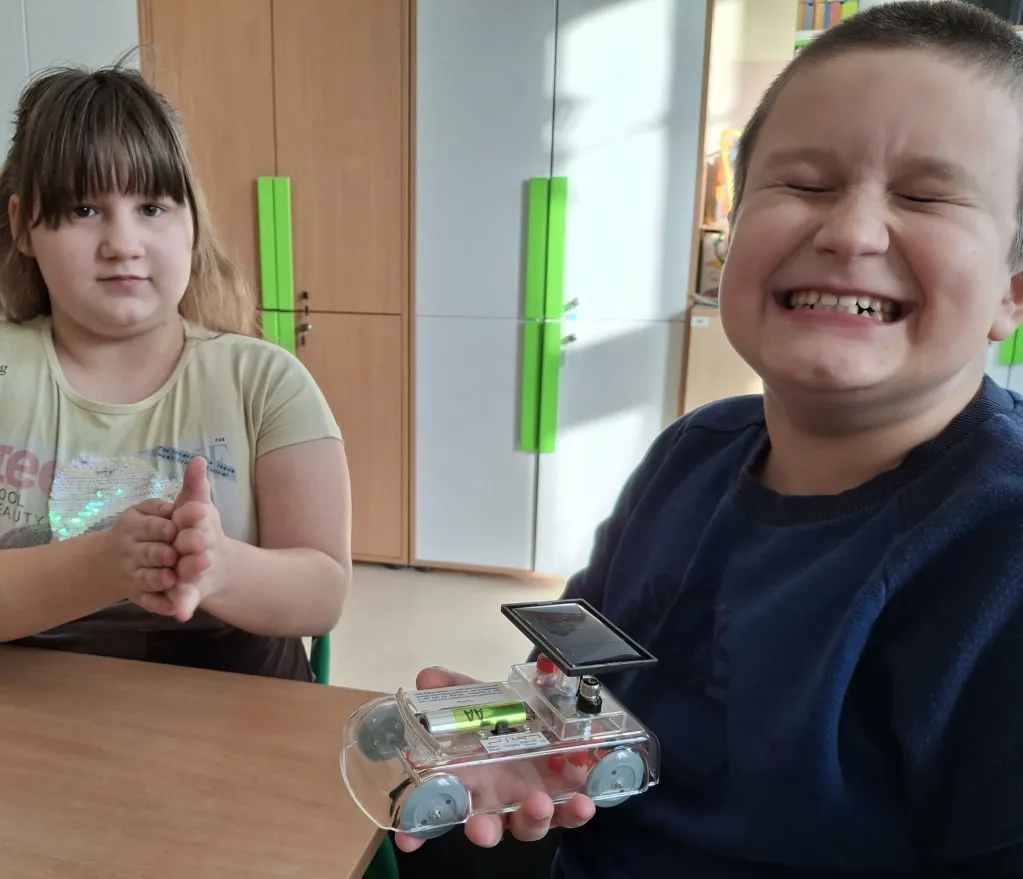 Podczas zajęć uczniowie samodzielnie wykonali żółty kosz do segregacji plastiku i metalu, a także przygotowali specjalne pudełka przeznaczone na zużyte baterie. Nie zabrakło również ciekawych doświadczeń – dzieci poznały zasadę działania samochodzika solarnego oraz przekonały się, że nawet cytryna może przewodzić prąd i zasilić małą lampkę.