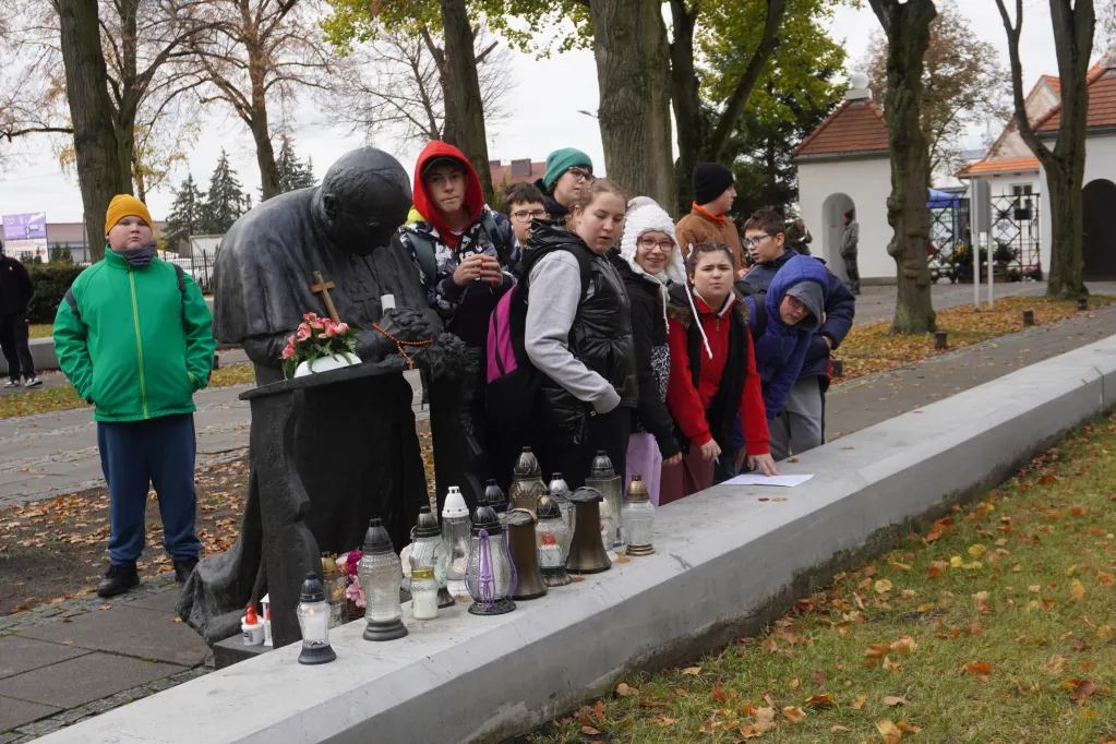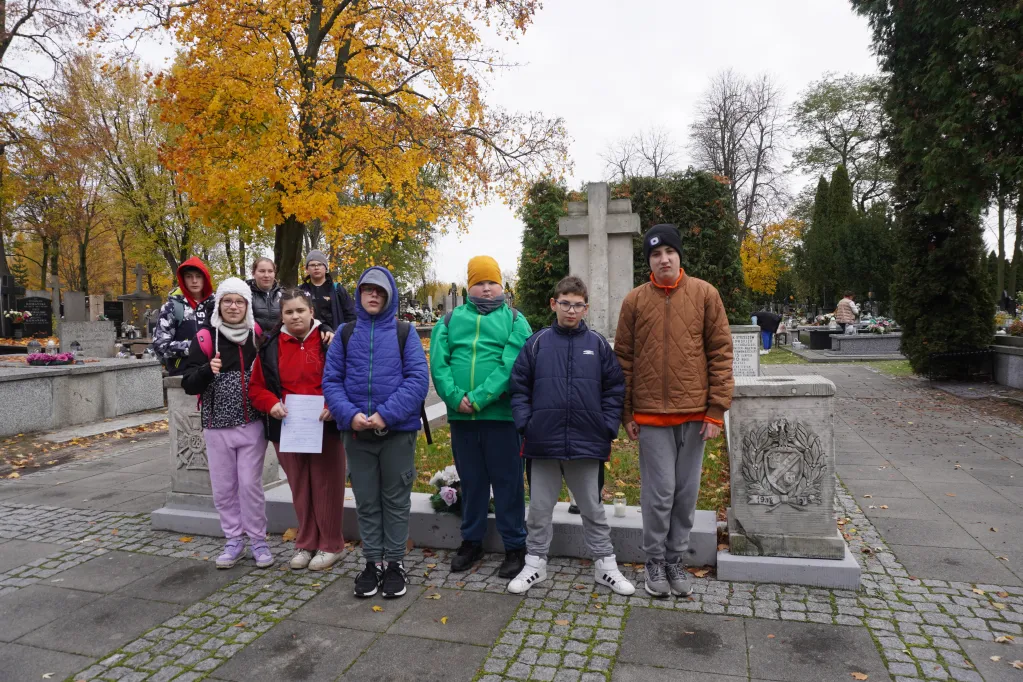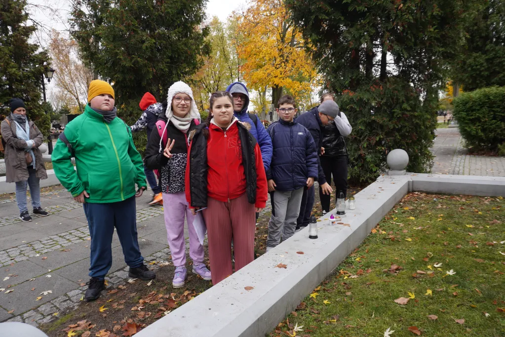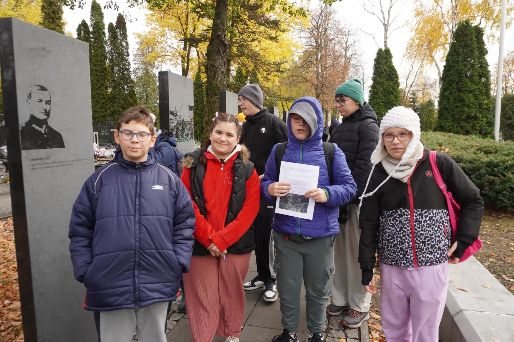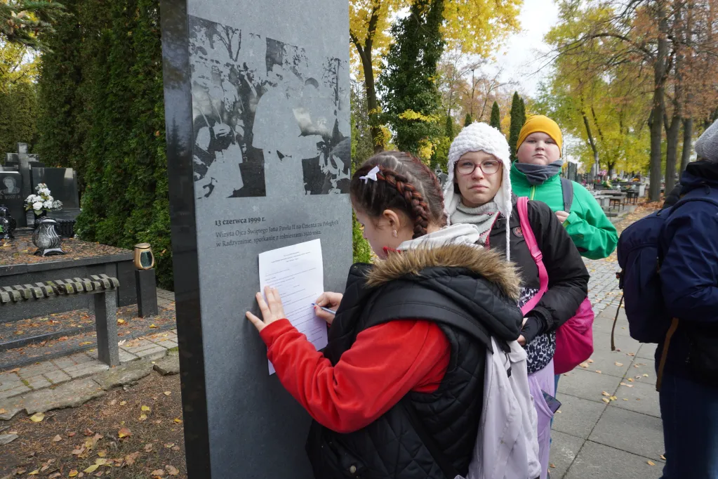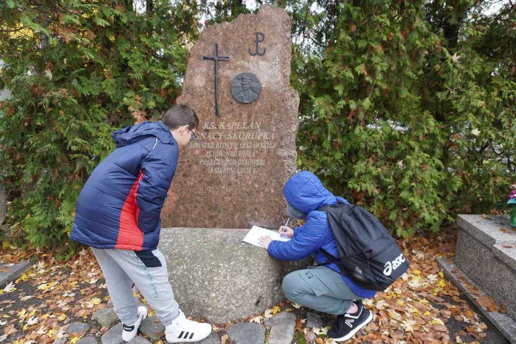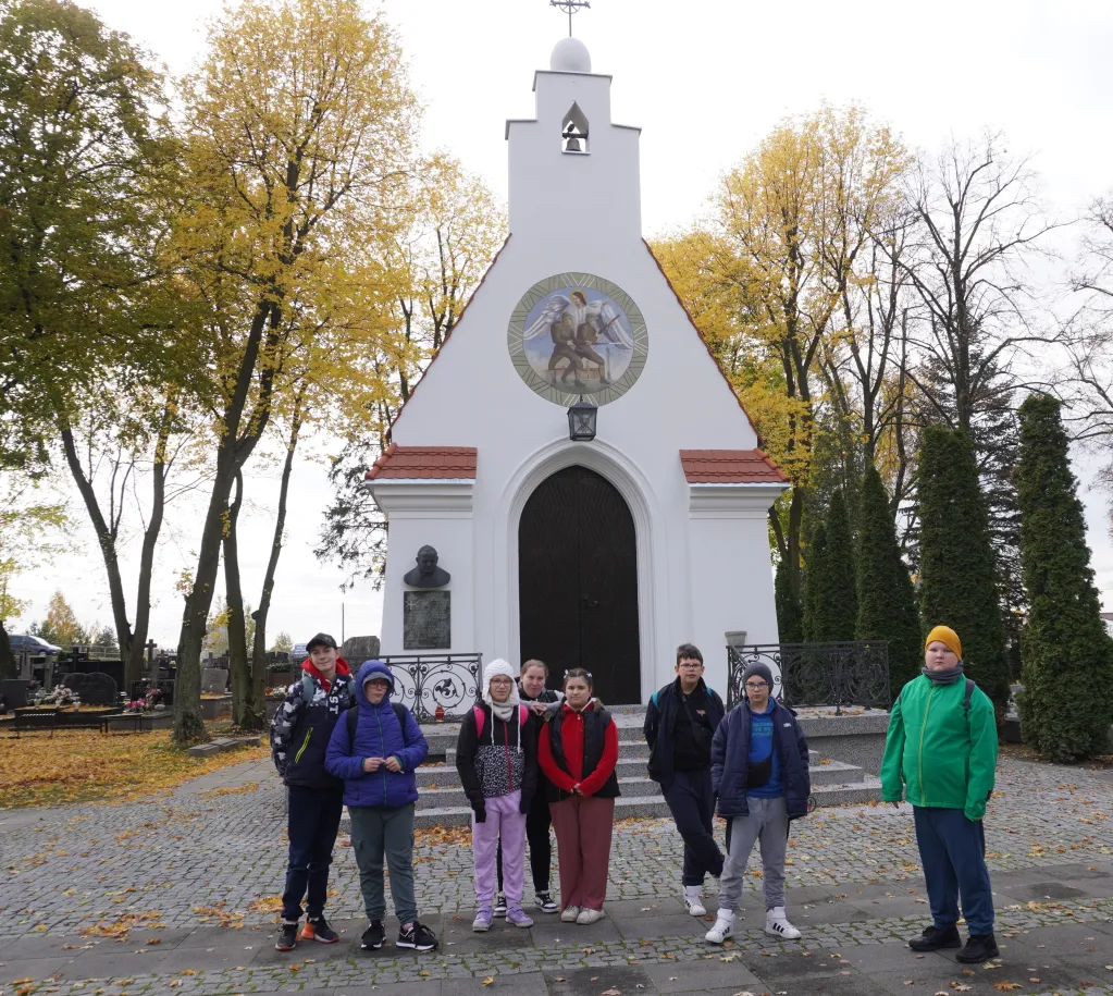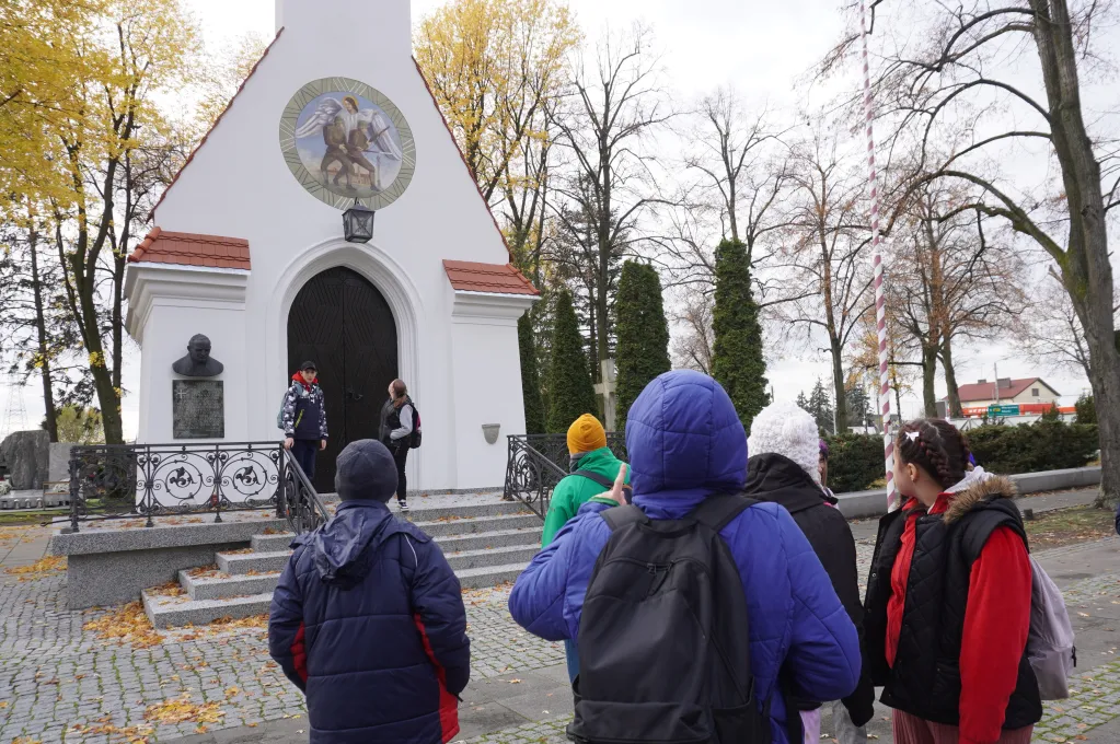 25 października 2025 r. wzięliśmy udział w rajdzie PTTK „Radzymin w czasie Bitwy Warszawskiej 1920”. Było to nasze ostatnie działanie w ramach projektu „105 rocznica Bitwy Warszawskiej 1920”. Najpierw zwiedziliśmy z przewodnikiem Muzeum Bitwy Warszawskiej 1920 r. Dowiedzieliśmy się o początkach wojny z bolszewikami, jej przebiegu, sile i uzbrojeniu Wojska Polskiego, bohaterach tej wojny i oczywiście samej bitwie pod Radzyminem, który w sierpniu 1920 r. kilkakrotnie przechodził z rąk do rąk. Potem poszliśmy z przewodniczką na cmentarz. Wysłuchaliśmy historii cmentarza, informacji o żołnierzach pochowanych w zbiorowych mogiłach, ważnych osobach, które odwiedzały cmentarz i znajdującą się na nim kaplicę. Najważniejszym spośród gości radzymińskiego cmentarza był, oczywiście, papież Jan Paweł II, który ma swój pomnik na cmetarzu.