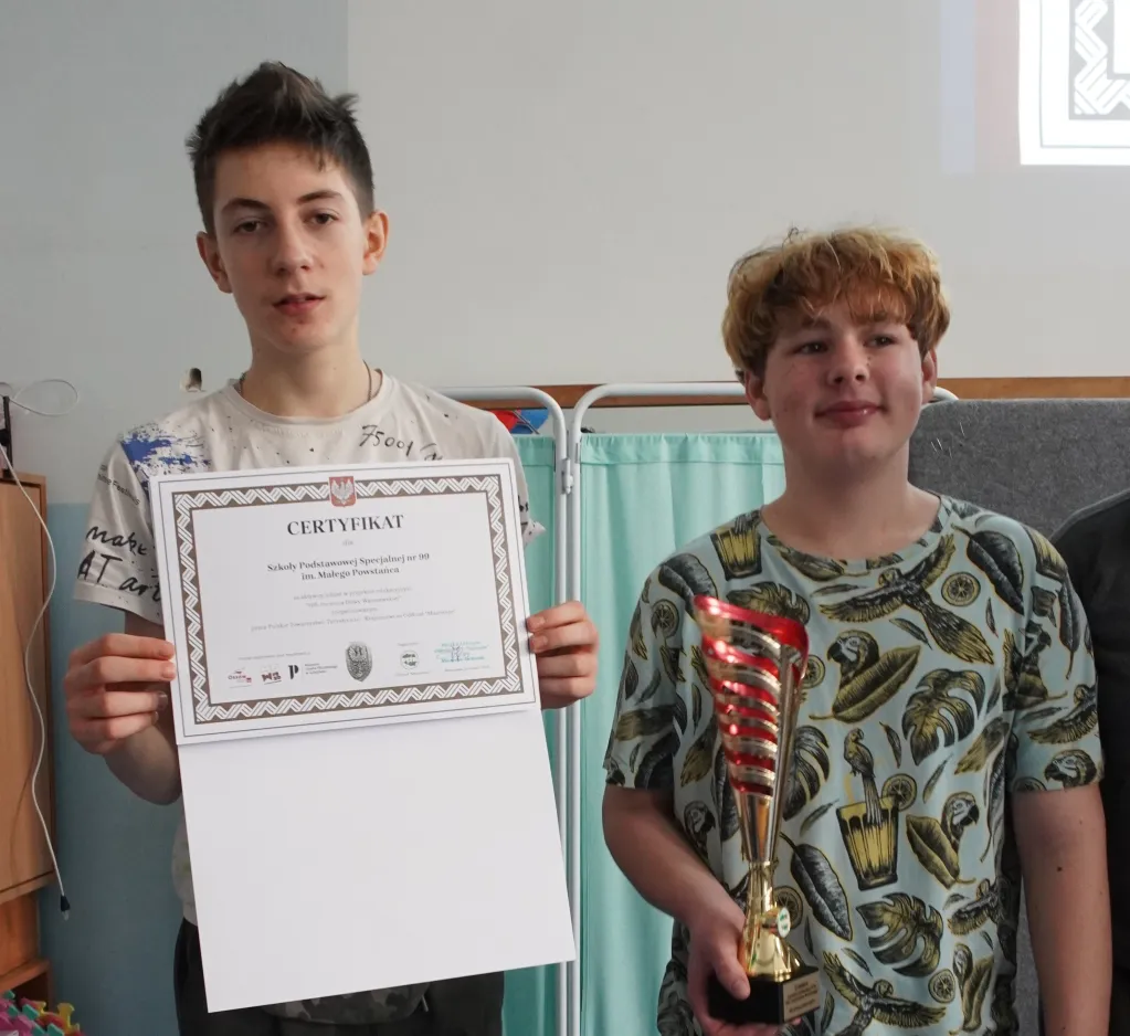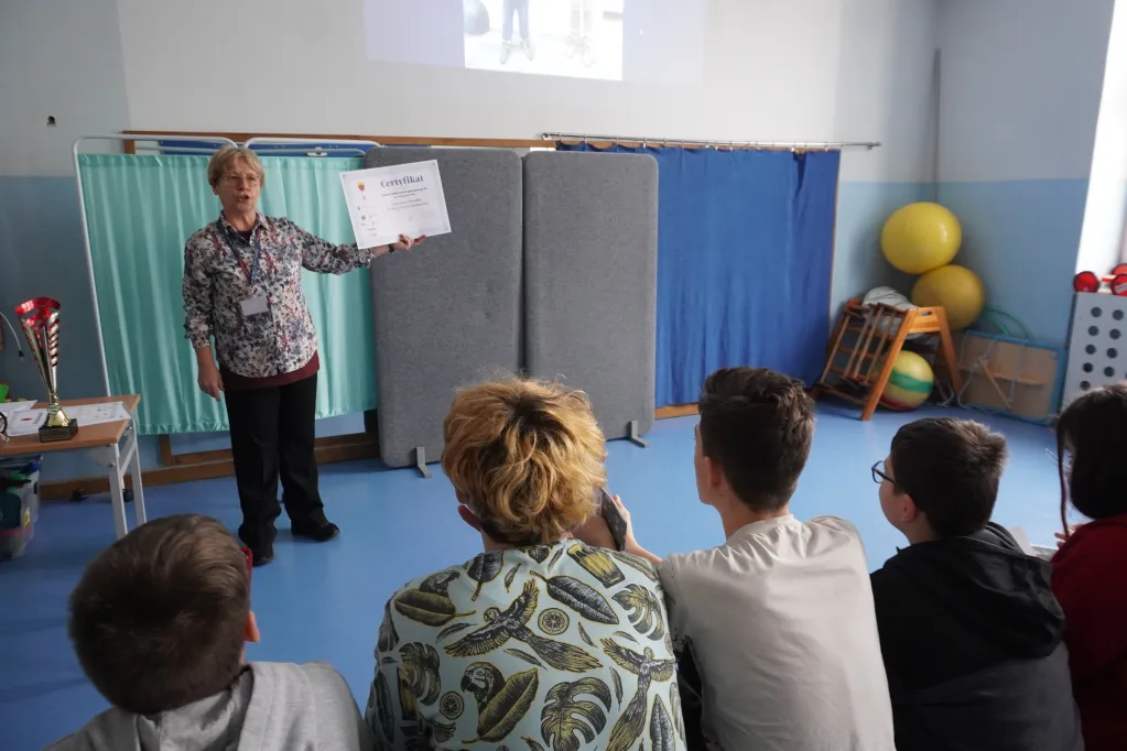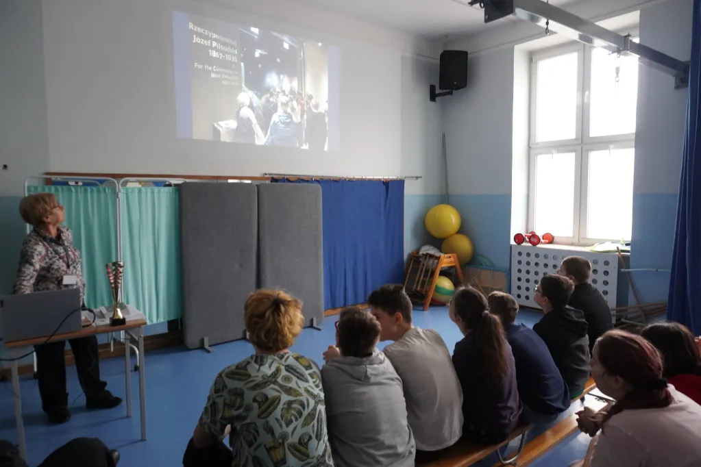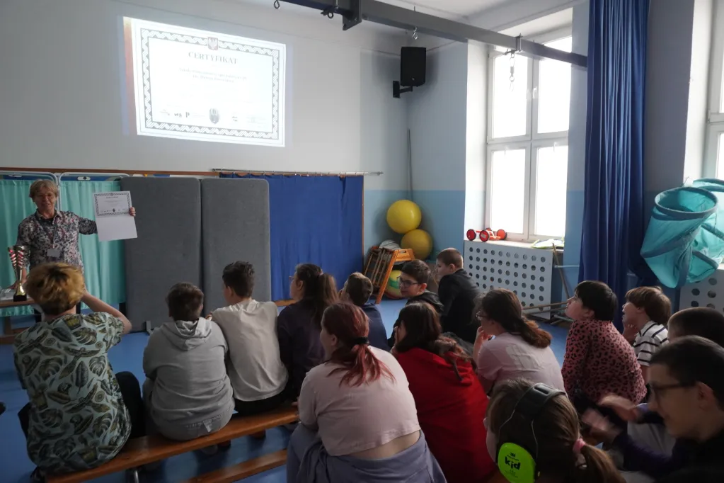 Pokazaliśmy też społeczności szkolnej nasz nowy certyfikat Towarzystwa Przyjaciół Warszawy. „Varsavianistyczna szkoła. Placówka Lokalnym Ośrodkiem Edukacji Varsavianistycznej”.