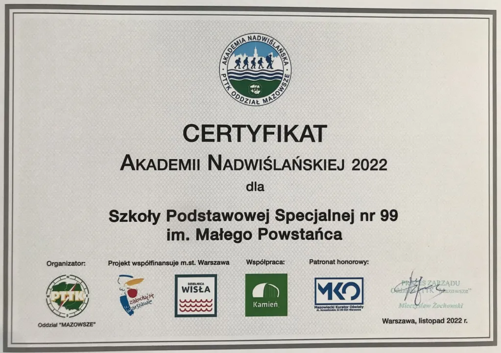 Branie udziału w działaniach PTTK Oddział „Mazowsze” organizowanych dla dzieci i młodzieży: grach terenowych, rajdach, spacerach z przewodnikiem, ornitologami, instruktorami ochrony przyrody, zajęciach o bezpieczeństwie w Komisariacie Rzecznym Policji, konkursach - Integrowanie społeczności szkolnej wokół działań na rzecz środowiska przyrodniczego związanego z Wisłą; uczestniczenie w organizowanych przez PTTK akcjach sprzątania doliny Wisły