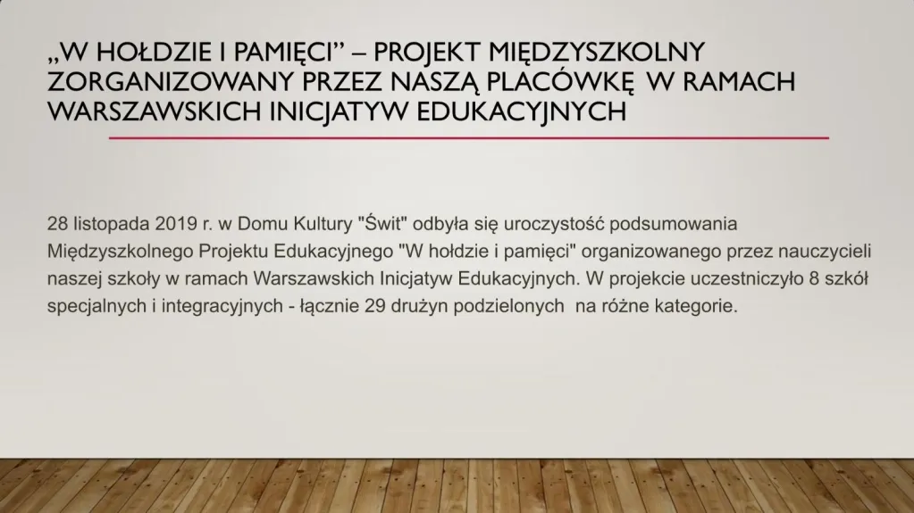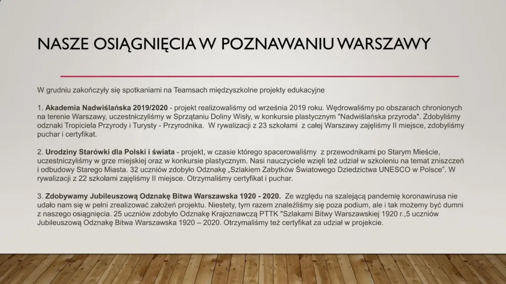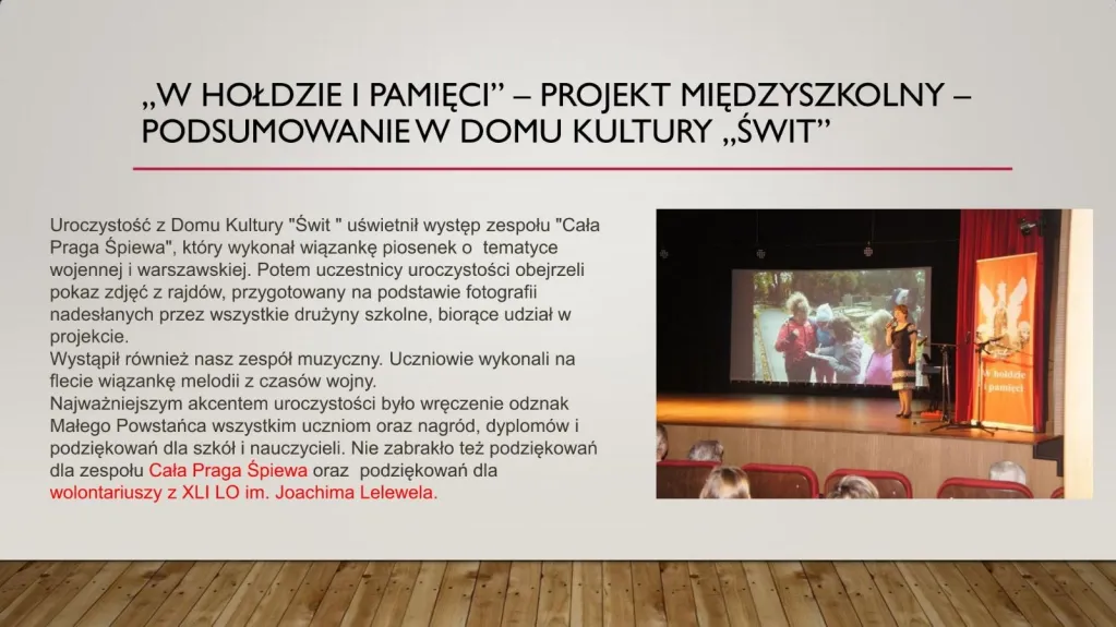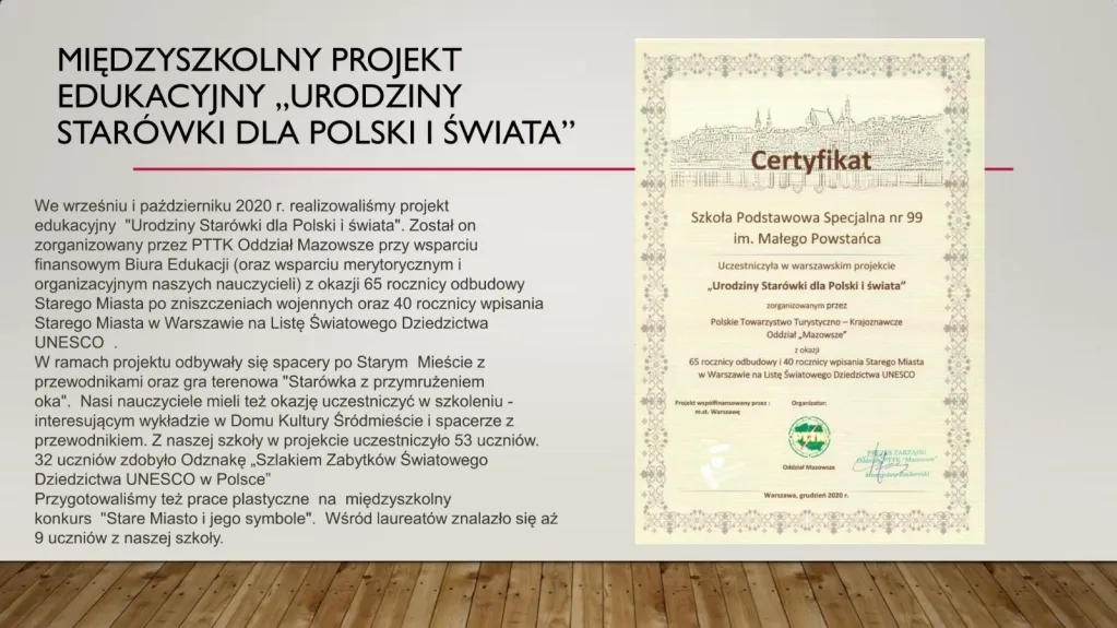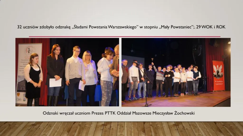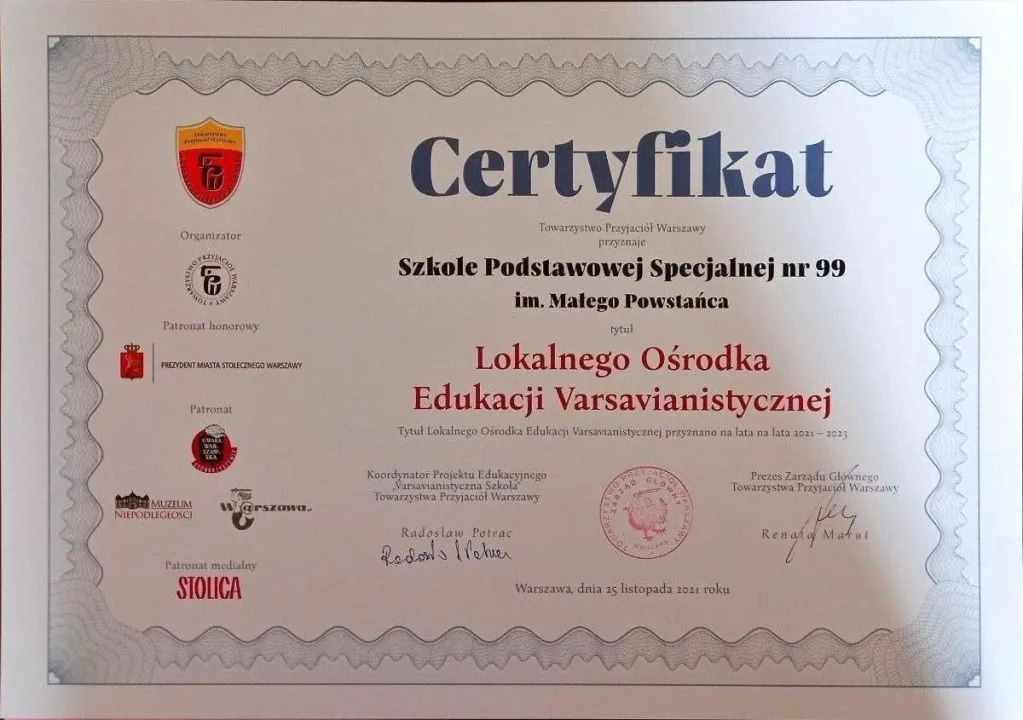 W uroczystości, która miała miejsce rozdane zostały podziękowania i certyfikaty 24 szkołom. Dzięki dwuletniej pracy nasza szkoła – już po raz drugi - otrzymała zaszczytny tytuł Lokalnego Ośrodka Edukacji Varsavianistycznej